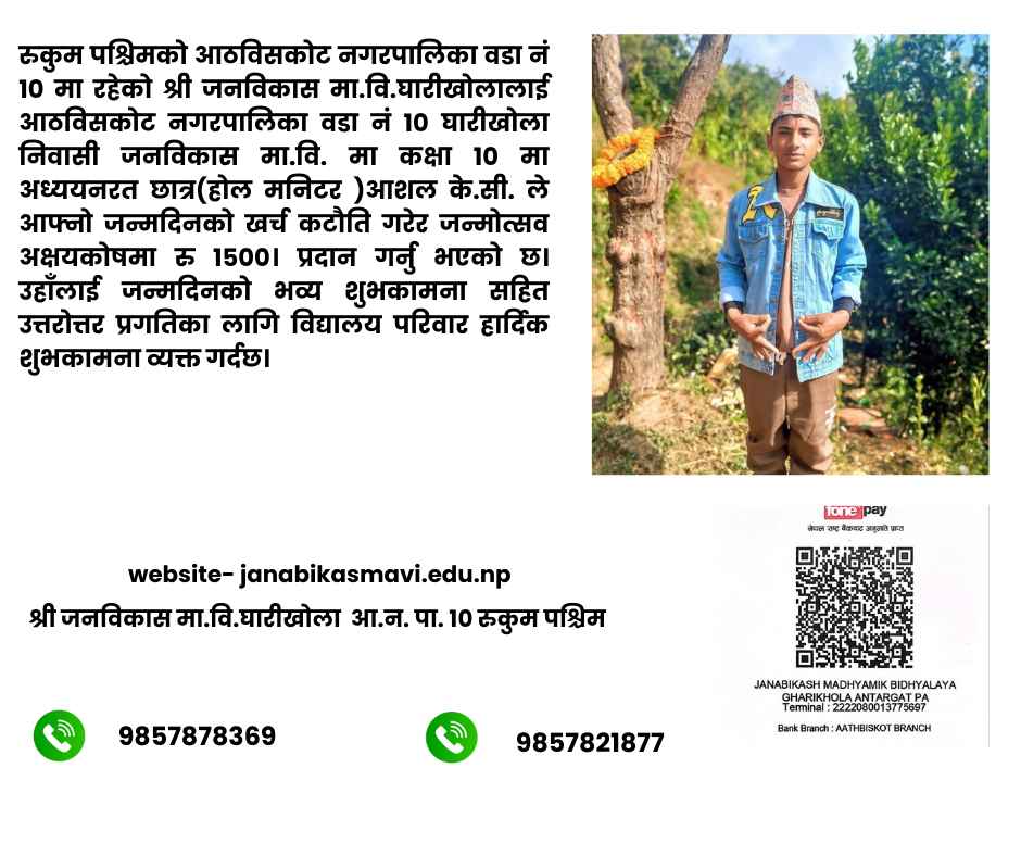 कक्षा ६ की मञ्जु केसीद्धारा विद्यालयलाई जन्मदिनको उपहार News, अर्थदान / By Janabikas MaVi … कक्षा ६ की मञ्जु केसीद्धारा विद्यालयलाई जन्मदिनको उपहार Read More »